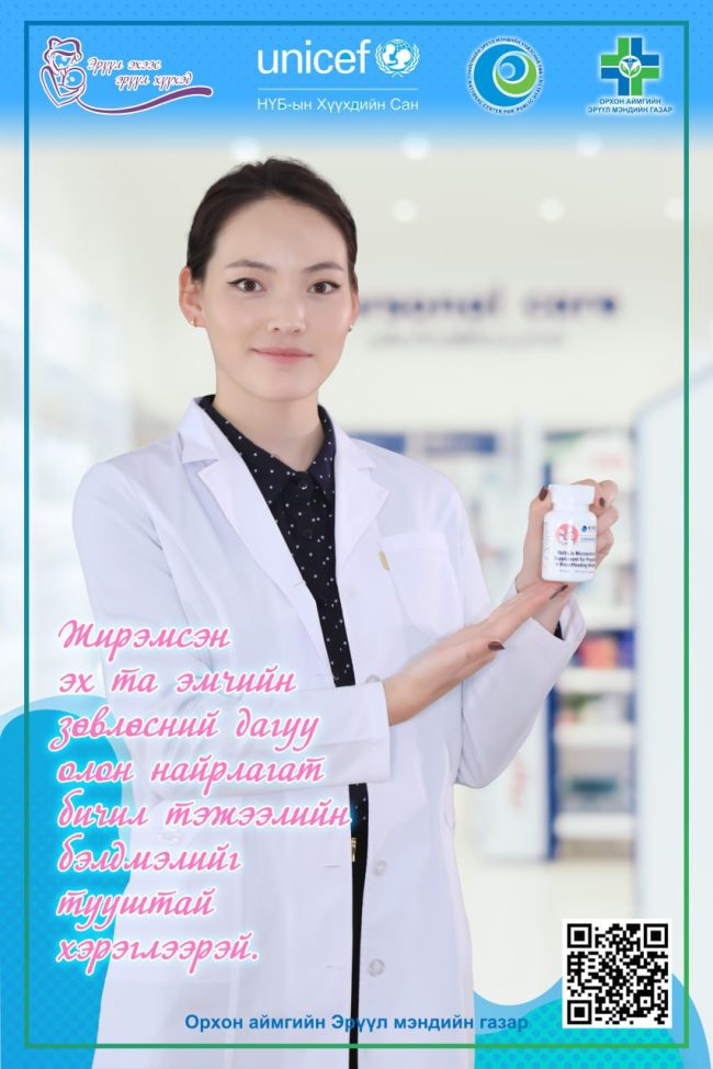 №3 Олон найрлагат бичил тэжээл нь эх, ургийн өсөлт хөгжилтөд чухал ач холбогдолтой 10 амин дэм (А, Д, Е, С, В1, В2, В6, В12, Фолийн хүчил), 5 эрдэс бодисын (Төмөр, цайр, зэс, селен, иод) агууламжтай бэлдмэл юм. НҮБ-ийн Хүүхдийн сангийн санхүүжилтээр ирсэн жирэмсэн эхчүүдэд олгох олон найрлагат бичил тэжээлийн бэлдмэлийг харьяа сум, өрхийн эрүүл мэндийн төвөөс авч уугаарай. Мөн дэлгэрэнгүй мэдээллийг QR кодыг уншуулан аваарай.