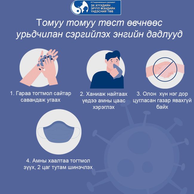 •Амны хаалт хэрэглэх, гараа тогтмол угаах, олон хүнтэй орчноос зайлсхийх уриалж байна.