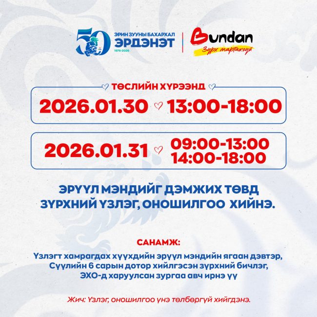 Эрдэнэт хотын 50 жилийн ойн хүрээнд 50 бяцхан зүрхийг эмчлэх зорилгоор “Эрдэнэт – 50 зүрх” төслийг “Бундан” ТББ болон “Зүрх мартахгүй хүүхдийн сан”-тай хамтран хэрэгжүүлэхээр санамж бичиг байгуулсан билээ.Жилийн турш хэрэгжих энэхүү төслийн хүрээнд Эрдэнэт хотын ирээдүй болсон 50 бяцхан зүрхийг эрүүл энх болгоно.Энэ амралтын өдрүүдэд “БУНДАН” ТББ болон “ЗҮРХ МАРТАХГҮЙ ХҮҮХДИЙН САН”-ийн хамт олон манай аймагт ажиллаж эхний үзлэг, оношилгоогоо хийхээр төлөвлөж байна.