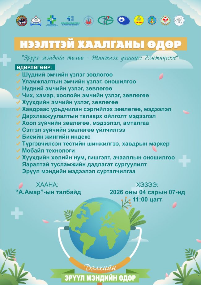 Дэлхийн эрүүл мэндийн өдөр-ийг тохиолдуулан “ЭРҮҮЛ МЭНДИЙН ТӨЛӨӨ – ШИНЖЛЭХ УХААНЫГ ДЭМЖИЦГЭЭЕ” уриан дор нээлттэй өдөрлөг зохион байгуулагдана.