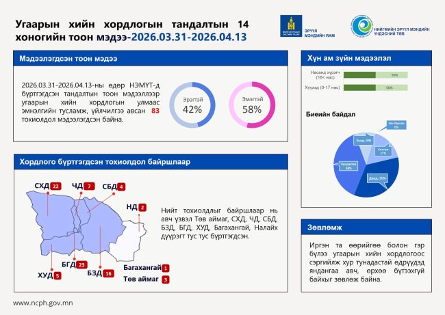 Угаарын хийн хордлогын тандалтын 14 хоногийн тоон мэдээ 2026.03.31-04.13