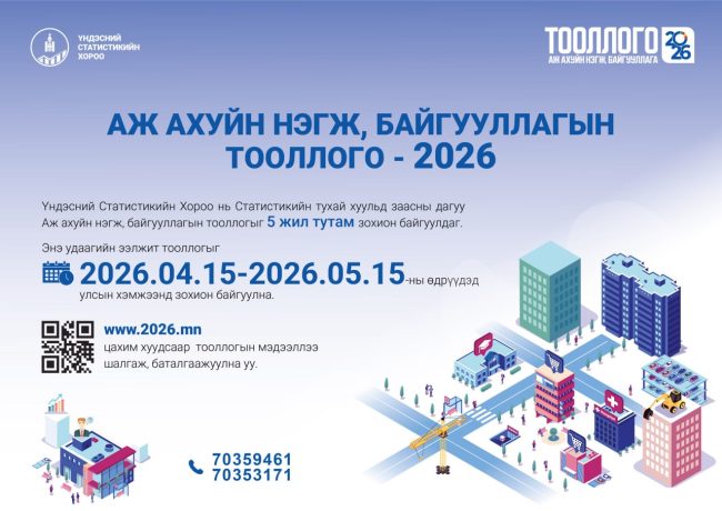 HomeБусад мэдээлэлАЖ АХУЙ НЭГЖ, БАЙГУУЛЛАГЫН ТООЛЛОГО-20262026-04-20 WWW.2026.MN цахим хуудсаар мэдээллээ шалгаж, ээлжит тооллогодоо идэвхтэй хамрагдаарай.