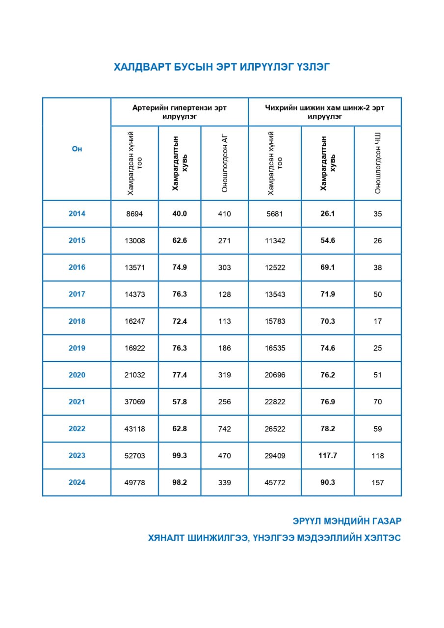 | 8 | Халдварт бусын эрт илрүүлэг үзлэг (АГ,ЧШ) | 2014-2024 |