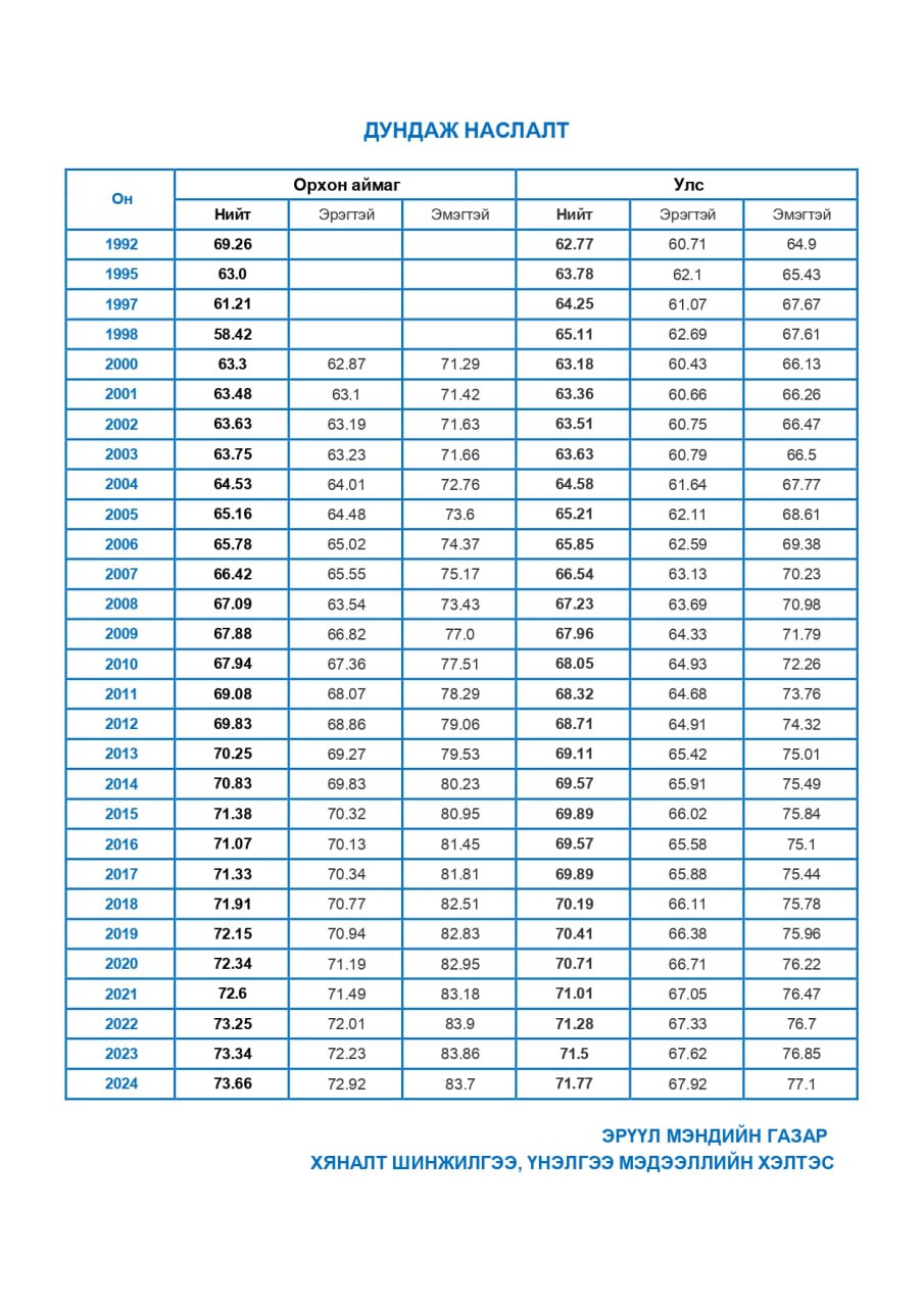 | 1 | Хүн амын дундаж наслалт | 1992-2024 |
