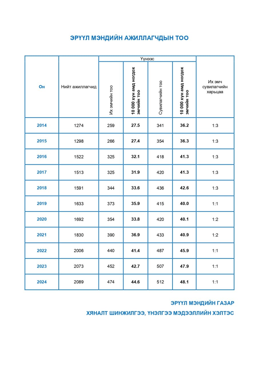 | 9 | Эрүүл мэндийн ажиллагчдын тоо | 2014-2024 |