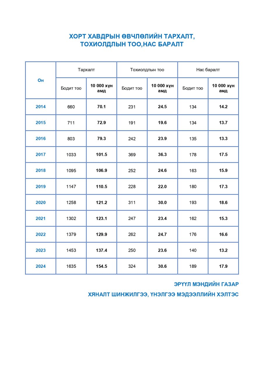 | 10 | Хорт хавдрын өвчлөлийн тархалт, тохиолдлын тоо,нас баралт | 2014-2024 |
