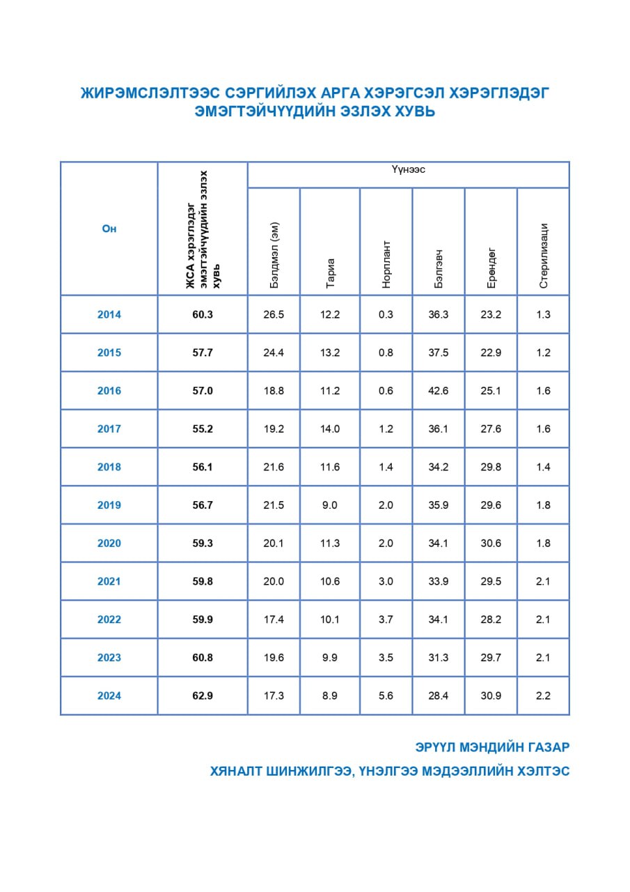 | 11 | Жирэмслэлтээс сэргийлэх арга хэрэгсэл, хэрэглэдэг эмэгтэйчүүдийн эзлэх хувь | 2014-2024 |