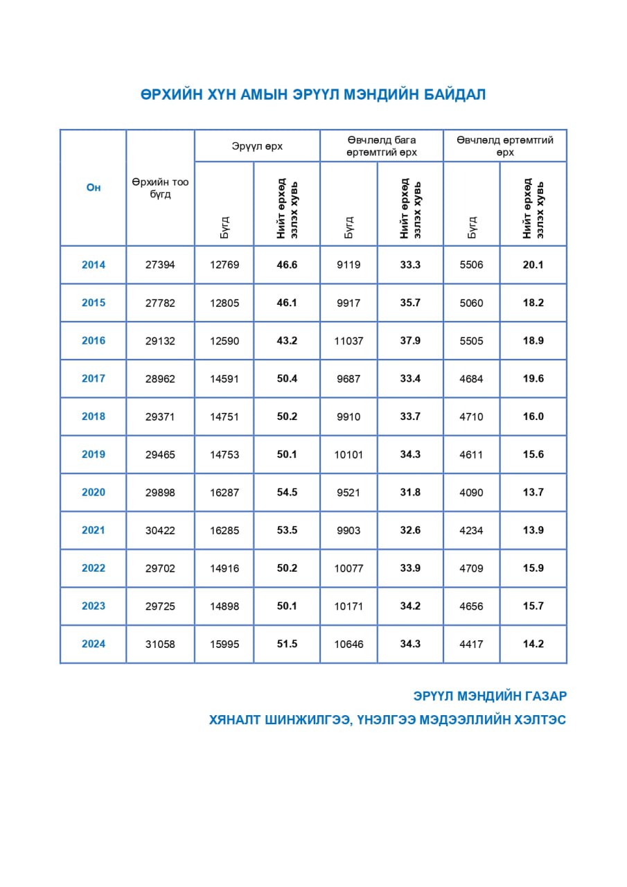 | 13 | Өрхийн хүн амын эрүүл мэндийн байдал | 2014-2024 |