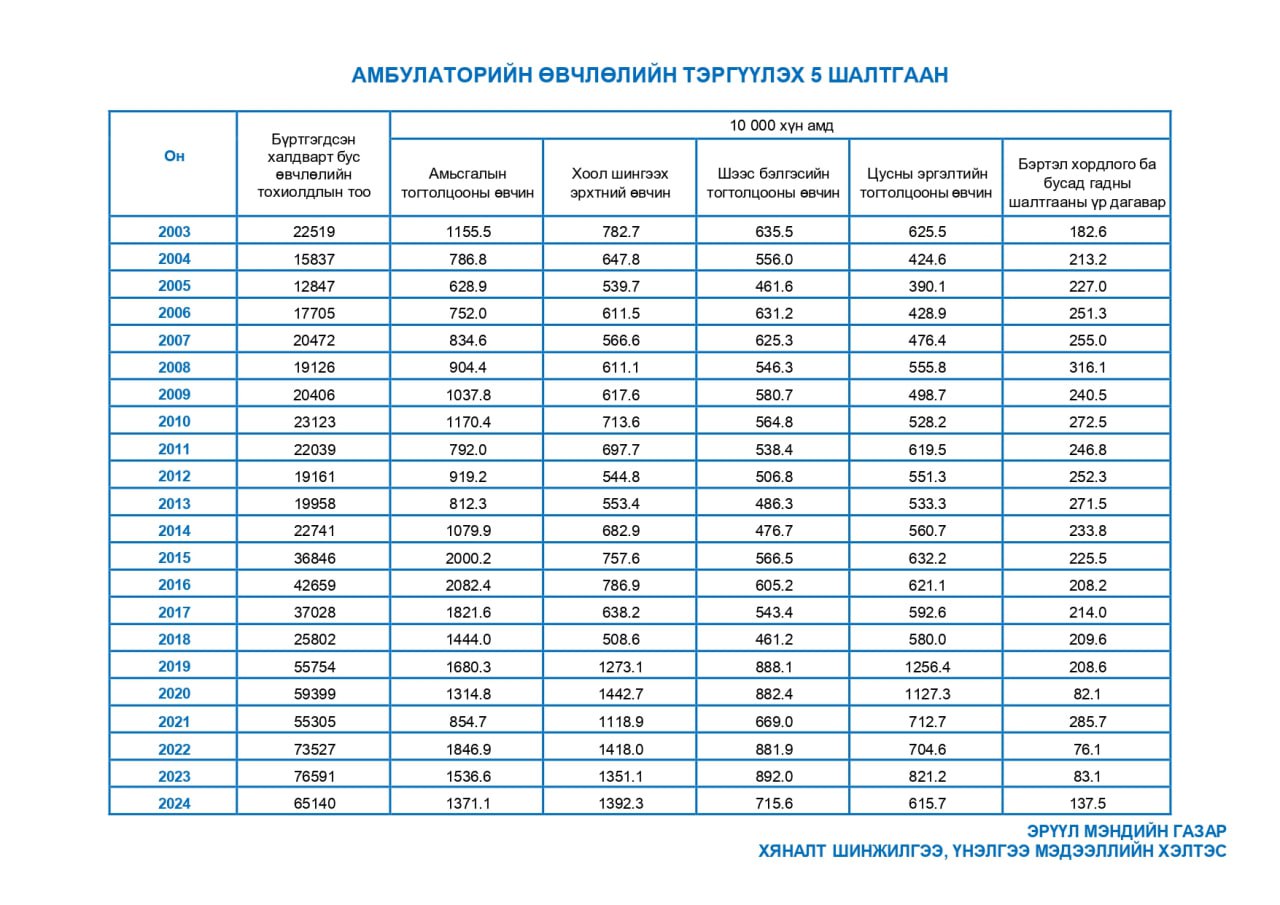 | 5 | Хүн амын амбуларторийн өвчлөлийн тэргүүлэх шалтгаан | 2003-2024 |